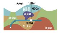 その層の中で約二億年前に磁鉄鉱と石灰岩とザクロ石でできた厚さ600メートルの自然の大ろ過器を通って地底に湧出したお水が「新生水」です。