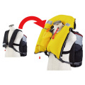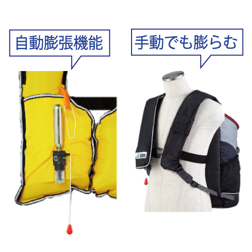 ●本製品は落水時に水を感知することにより膨張する仕組みになっておりますが、当該機能はあくまで補助的なものです。海上に脱出する場合や万一落出された場合は、まず手動レバーを引いて膨張させるようお願い申し上げます。
