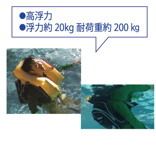 高浮力を保ちながら救助を待つことができます、また頭部を水面上に出し、安心して浮いていることができます。