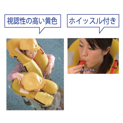 ●視認性の高い黄色…水上で発見しやすいよう気室の色は黄色です。特に夜間の海では、黄色はよく目立ち、救助に役立ちます。