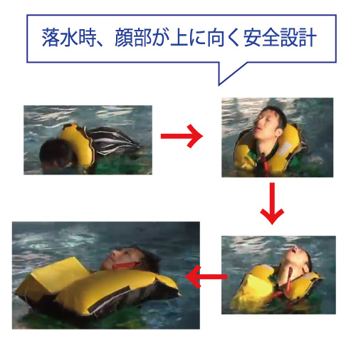 ●落水時、顔部が上に向く安全設計…"万が一気を失っても自動的に気道を確保"