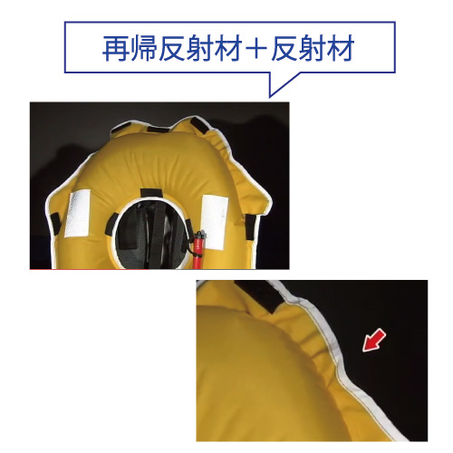 ライフジャケット部分、リュック部分至る箇所に再帰反射材を使用しており、遭難時が夜間の場合でも、光を反射します。それにより発見を早め、救命に役立ちます。